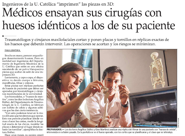 Hemos logrado dar atención a todos los requerimientos efectuados por cirujanos maxilofaciales, oncólogos, traumatólogos y neurocirujanos que han contactado nuestros servicios a lo largo de todo el país, tanto de instituciones de salud públicas como privadas, para  diversos procedimientos quirúrgicos, mediante la impresión de biomodelos óseos con distintos grados de complejidad. Entregando un producto exitoso de alta calidad (geometría dimensional fidedigna a la del paciente) y con tiempos de respuesta adecuados.